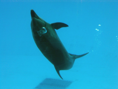 巨大水槽内のイルカです、水中では背泳ぎが好きみたい。